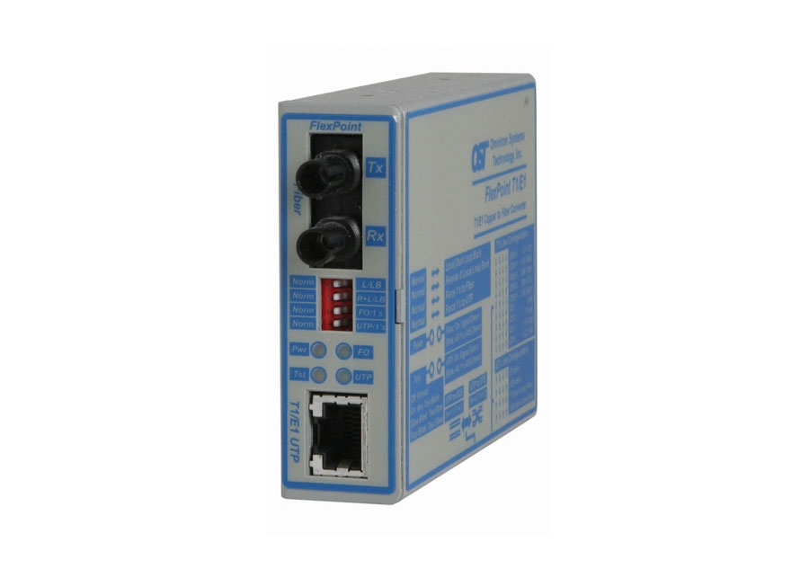 The FlexPoint T1/E1 media converter provides standard T1 (1.544Mbps) or E1 (2.048Mbps) copper to fiber conversion and can be used to extend the demarcation point between service provider and networking equipment. T1/E1 media converters operate in pairs, providing distance extension over fiber.
