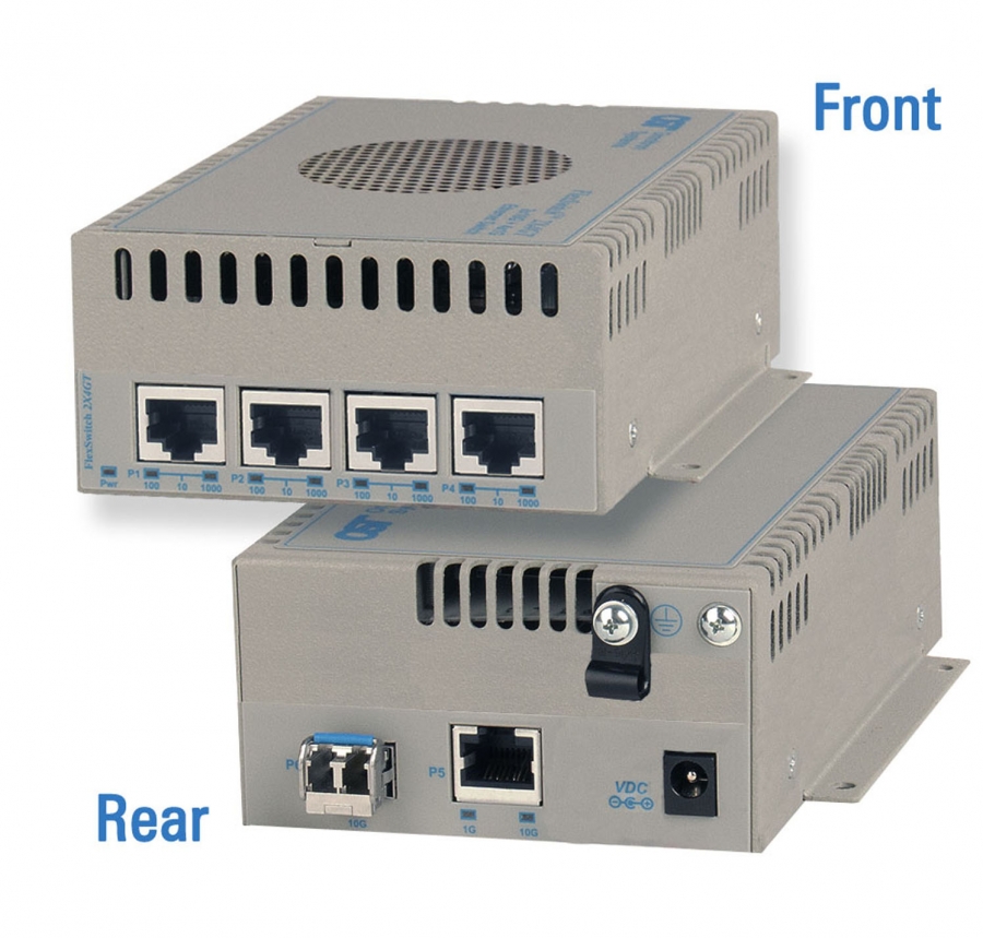 The FlexSwitch™ 2X4GT is a six-port Ethernet switch with four 10/100/1000 RJ-45 ports, one 10G (10GBASE-R) SFP+ or XFP fiber port, and one RJ-45 port that auto-negotiates to Gigabit or 10G (1000BASE-T/10GBASE-T). FlexSwitch 2X4GT models that support 10G SFP+ transceivers also support Gigabit transceivers for a seamless upgrade path from a Gigabit to a 10G fiber link. This compact, unmanaged switch features rate-switching and MAC learning for bridging Gigabit and 10 Gigabit Ethernet networks.