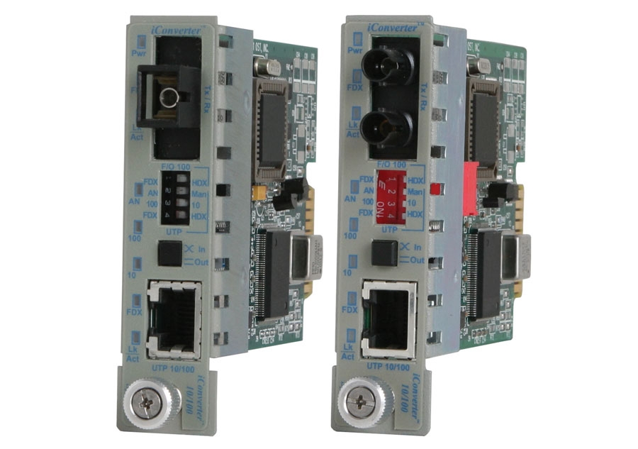 The iConverter 10/100 managed media converters are members of the modular iConverter product family and provide 10BASE-T or 100BASE-TX copper to 100BASE-X fiber conversion.