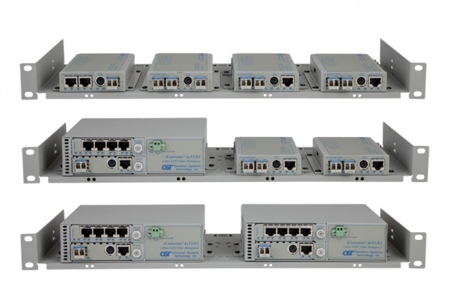 The 1U 19" Rack-Mount Shelf accommodates iConverter standalone Network Interface Devices and media converters, the iConverter 1-Module chassis and the iConverter 2-Module chassis.