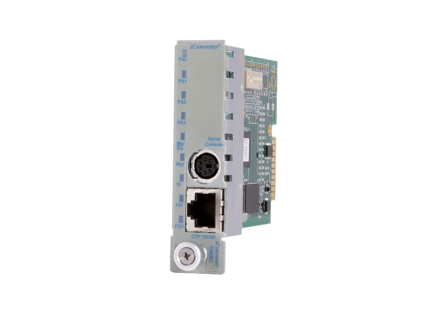The iConverter NMM2 provides comprehensive remote monitoring, configuration and alarm notification functions for all iConverter managed media converters and Network Interface Devices (NIDs). Installed in any slot of an iConverter chassis, the NMM2 manages all other modules and power supplies installed in the chassis through a high-speed management backplane. Additionally, all remote NIDs linked to the managed iConverter chassis can be managed by the installed NMM2 through a secure IP-less management channel.
