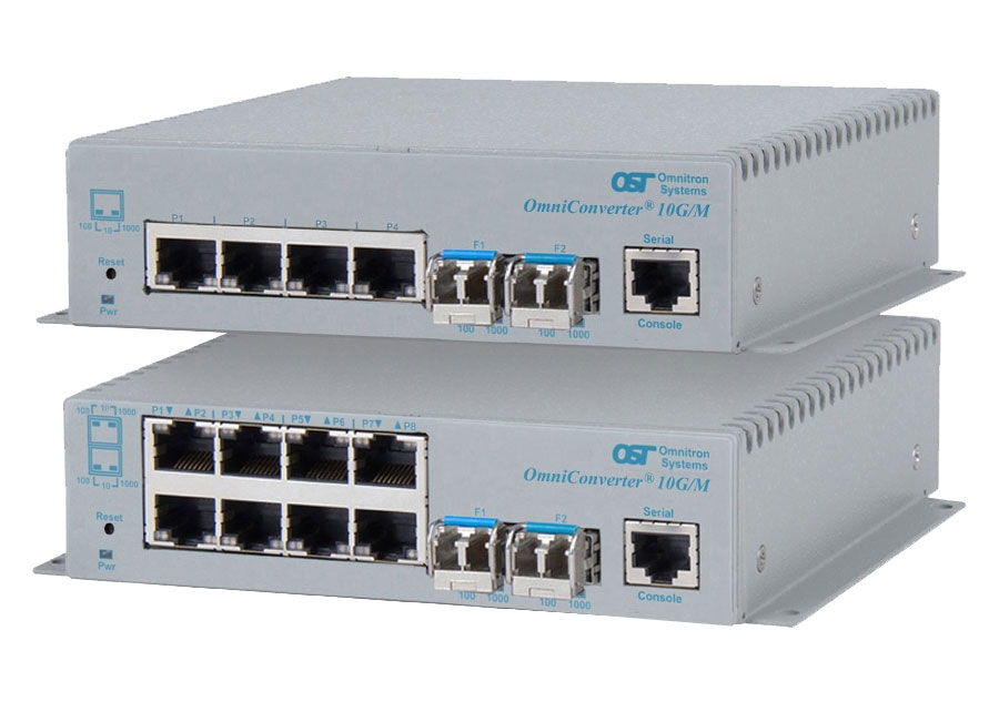 The OmniConverter 10G/M is a managed compact Ethernet switch that features two 1/10G uplink ports and four or eight 10/100/1000 RJ-45 copper user ports. The OmniConverter 10G/M enables network distance extension with fiber or copper cabling.