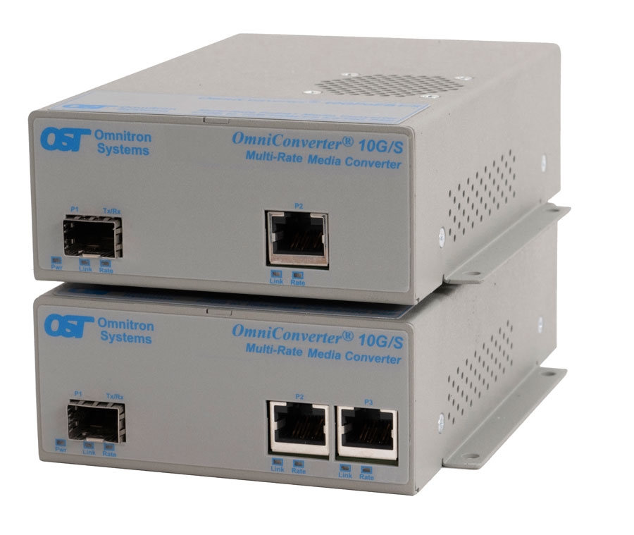 The OmniConverter 10G/S are unmanaged 10G Ethernet media converters featuring one 1/10G SFP/SFP+ uplink port and one or two multi-gigabit/multi-rate RJ-45 user ports.