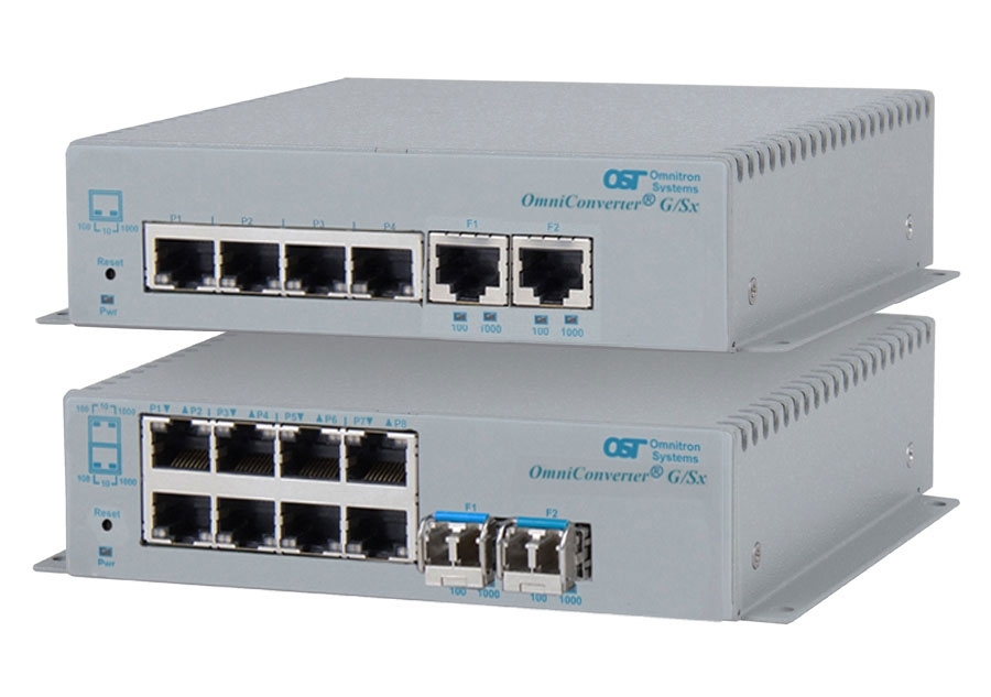 The OmniConverter G/Sx is an unmanaged compact gigabit Ethernet switch that features copper or fiber uplink ports and four or eight 10/100/1000 RJ-45 copper user ports. The OmniConverter G/Sx enables network distance extension with fiber cabling.