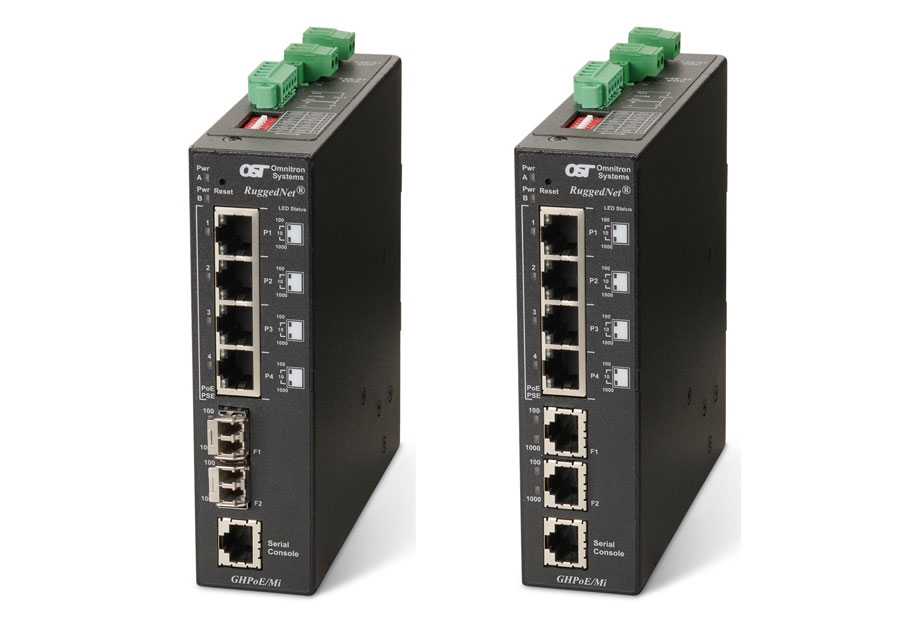 The RuggedNet PoE switches are available with fixed fiber ST, SC, and LC connectors or Small Form Pluggable (SFP) transceiver ports. Fiber ports support multimode or single-mode and dual fiber or single-fiber with distances up to 140km. SFP models support a variety of distances in standard, CWDM and DWDM wavelengths.