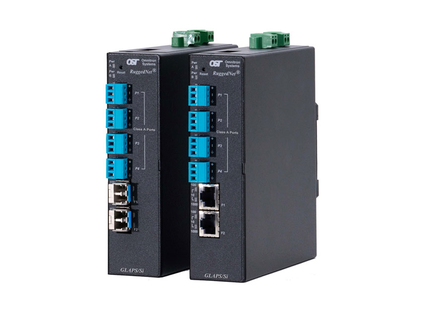 The GLAPS/Si switch features four 10BASE-T1L 3-pin terminal or IEC 63171-2 ports and two 10/100/1000 RJ-45 or 100/1000 fiber SFP uplink ports.