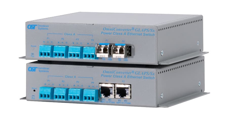 The OmniConverter GLAPS/Sx is an unmanaged Single Pair Ethernet (SPE) switch that features copper or fiber uplink ports and four single-pair 10BASE-T1L copper ports designed for digital instrumentation solutions used for Industrial process automation applications. The SPE switch can be deployed in a spur or trunk topology.